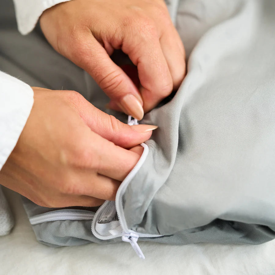 Painopeitoissamme on 8 pientä silmukkaa, yksi kummassakin kulmassa ja yksi kummankin sivun keskellä, jotka on suunniteltu peiton kiinnittämistä varten Finnrest™ ekologisiin bambupussilakanoihin. Painopeiton kiinnittäminen suojaansa estää sen siirtymisen ja kasautumisen, mikä takaa mukavan ja keskeytymättömän yöunen. Voit myös käyttää omaa tavallista pussilakanaa.